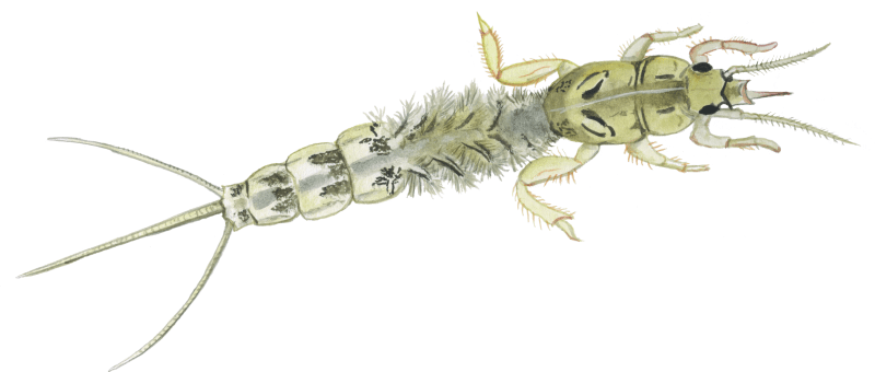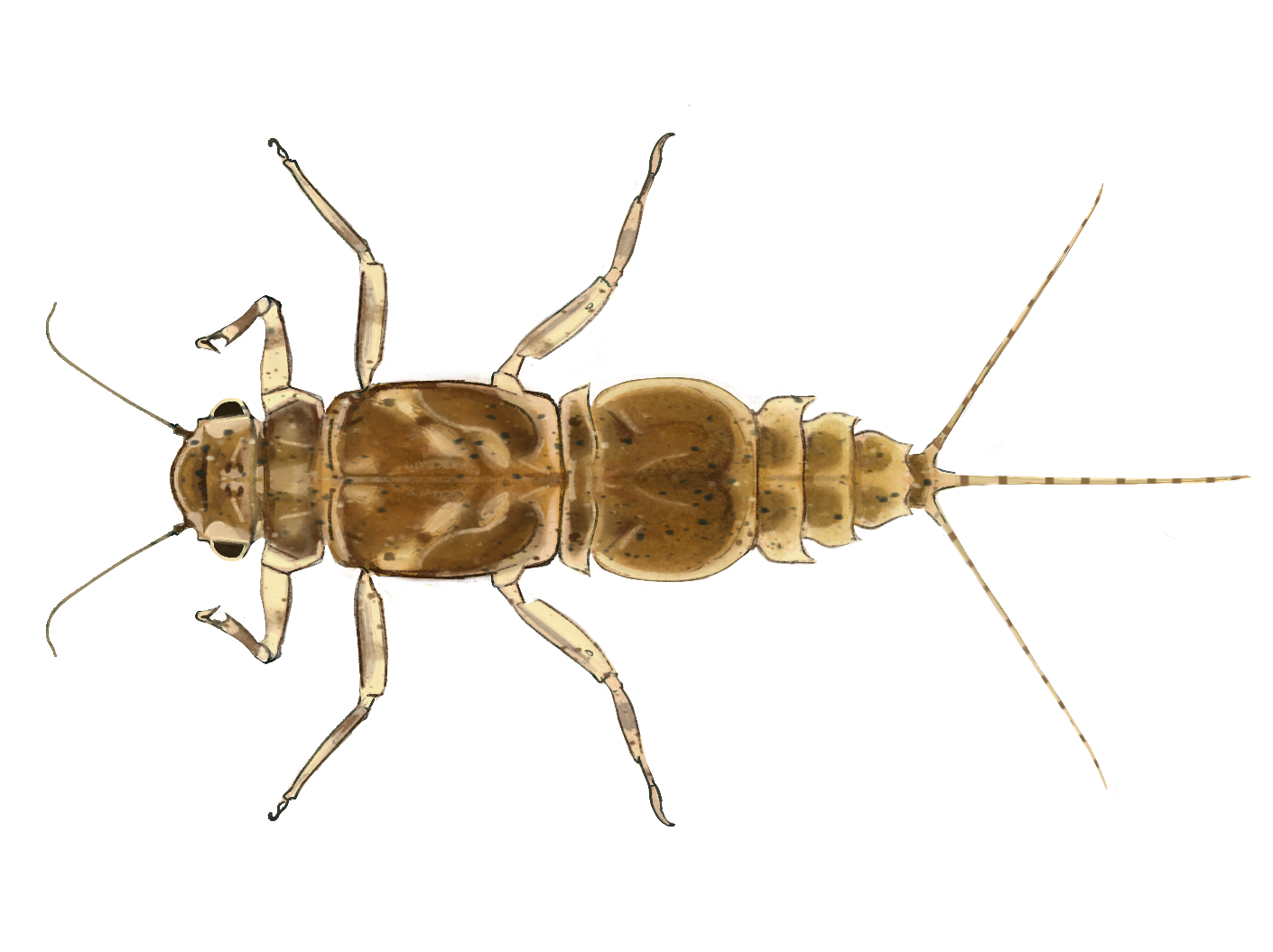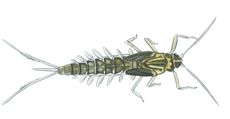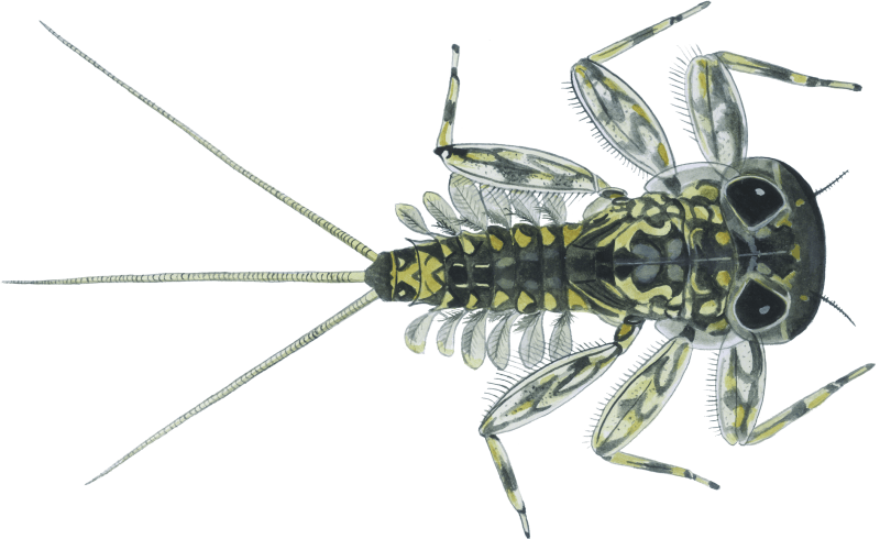 Platte eendagsvlieglarven hechten zich stevig vast op stenen en harde ondergronden in snelstromend water.