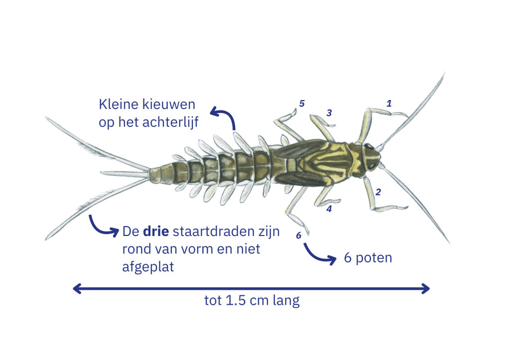 De slijkvlieglarve en eendagsvlieglarve kun je onderscheiden aan de staart. De slijkvlieglarve heeft namelijk één ‘harige’ staart, terwijl de eendagsvlieglarve drie lange, dunne staartdraden heeft. Ook de larve van een libel is duidelijk anders: deze is een stuk groter (tot wel 7 cm) en heeft 3 tot 5 korte, stompe uitsteeksels aan het achterlijf.