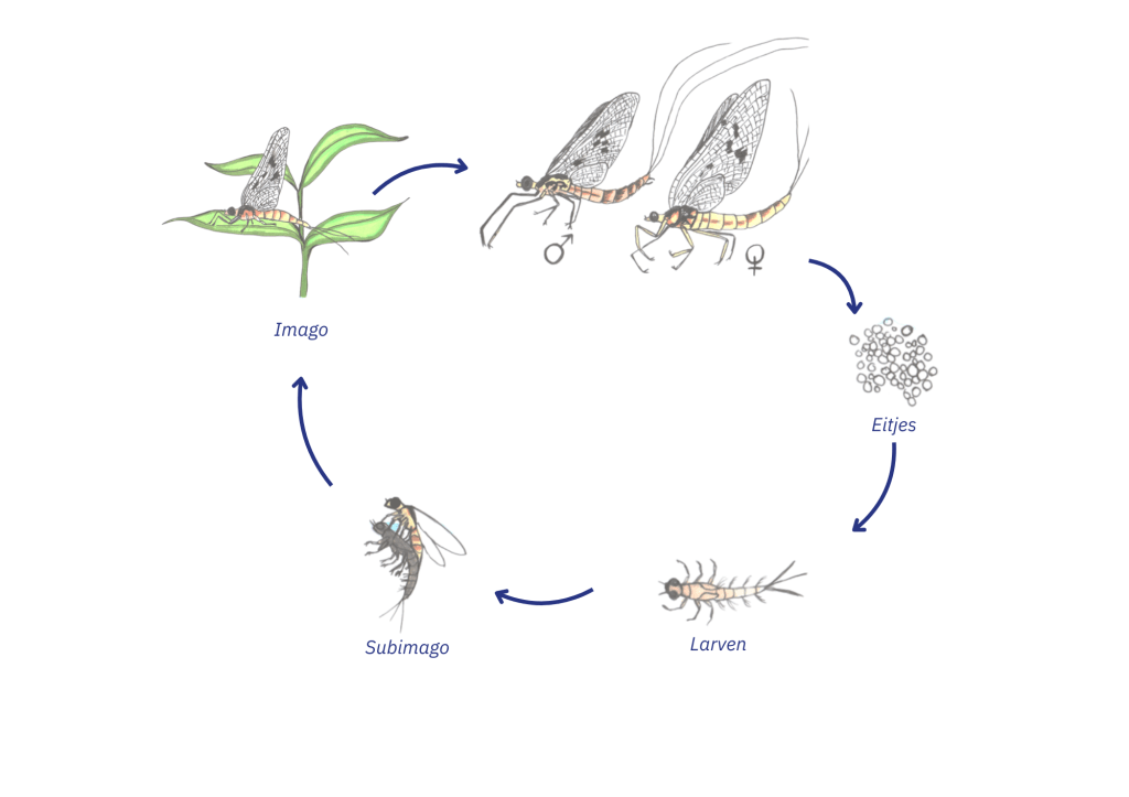 De subimago gaat nu op zoek naar een plekje waar hij vervelt tot het volwassen dier. Dit volwassen dier noemen we imago. De imago en subimago lijken erg op elkaar. Het grootste verschil zit hem in de vleugels. Subimago’s hebben dunne, grijzige vleugels waar heel kleine haartjes op zitten. Deze haartjes helpen ze uit het wateroppervlak te komen doordat ze waterafstotend zijn. Als imago zijn de vleugels helder, glanzend en doorzichtig.